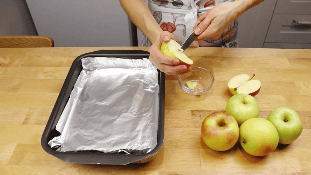 Яблучне пюре: Кисло – солодкі яблука розрізаю навпіл, прибираю серцевину. Вкладаю у форму. Форму слід застелити фольгою.