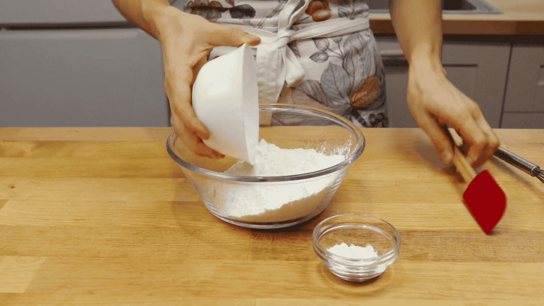 Коржі: Борошно змішую з крохмалем та розпушувачем.