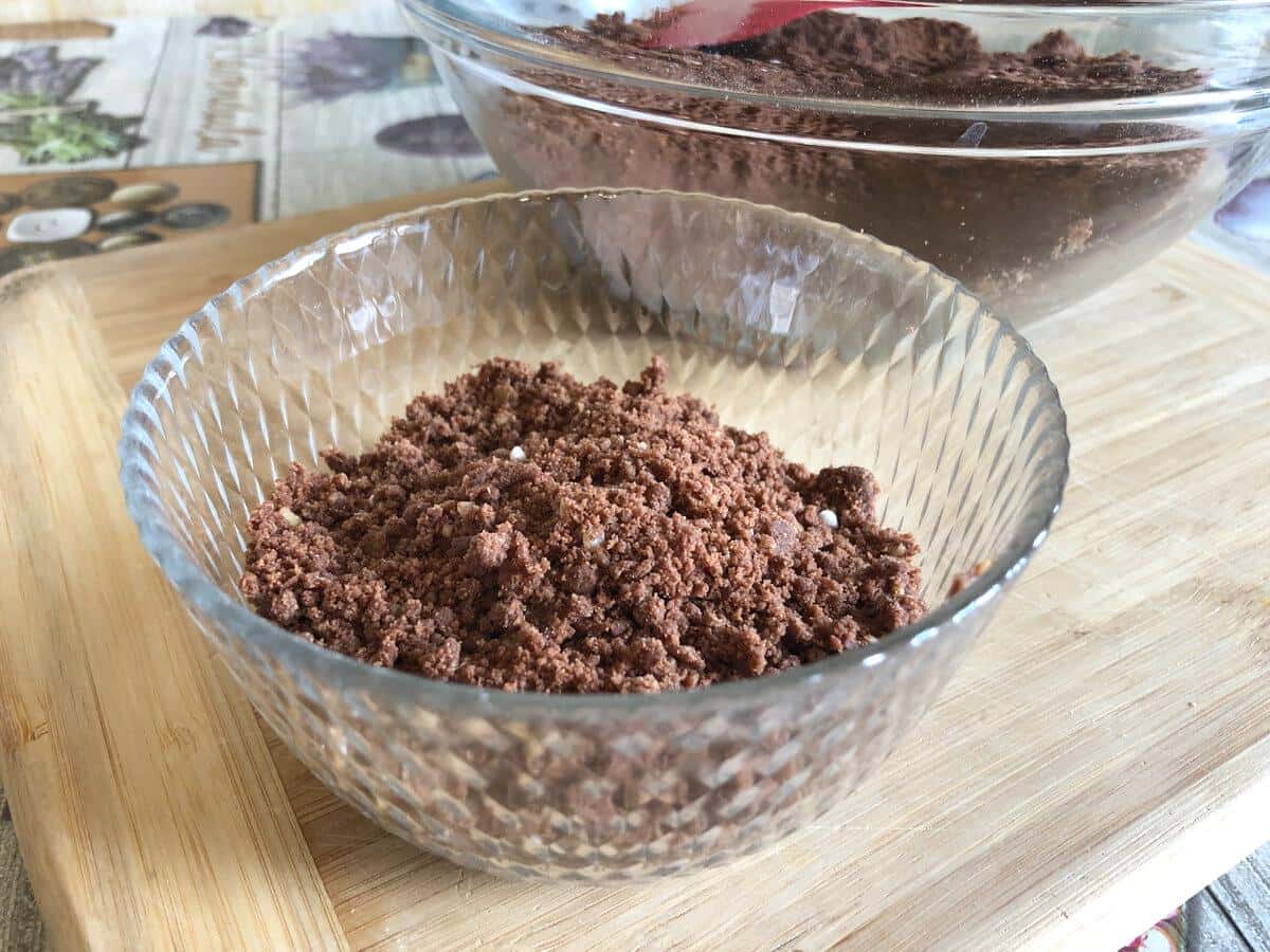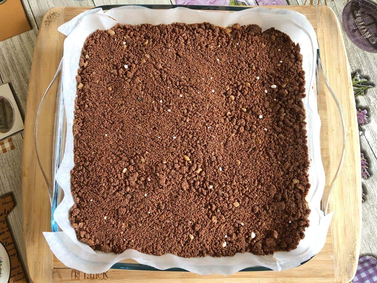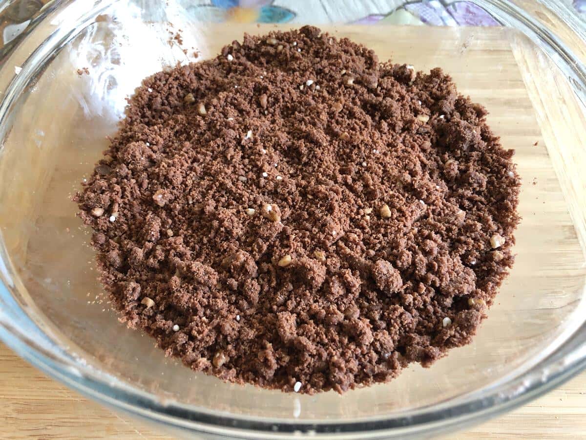 1 / 4 шоколадної крихти відкладаємо в окрему миску і прибираємо в холодильник, вона нам знадобиться пізніше.