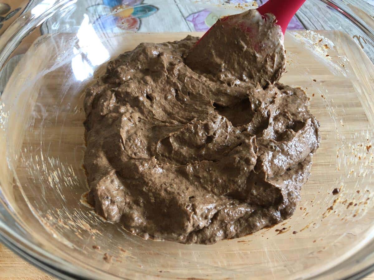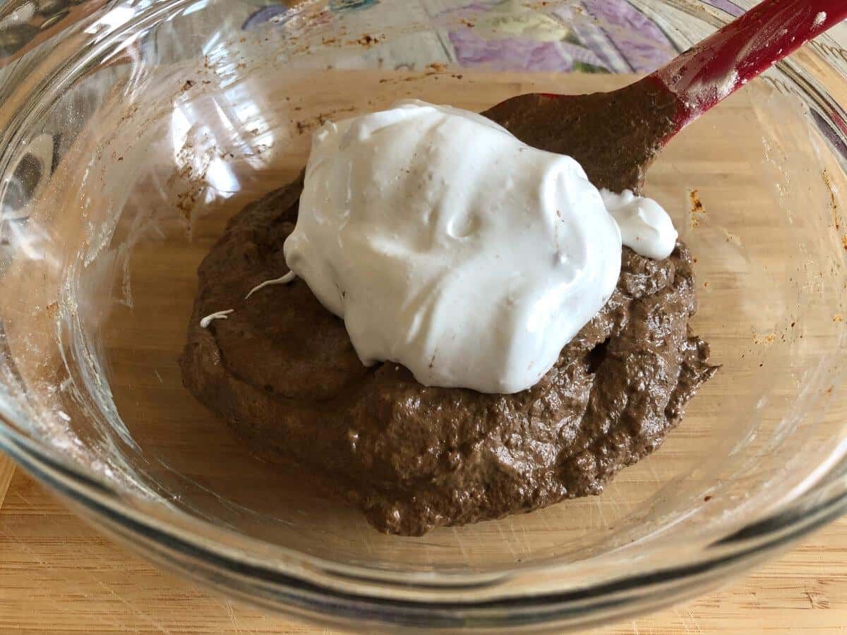 Білки в три прийоми додаємо до йогурту з чорносливом, акуратно вмішуючи лопаткою знизу вгору.