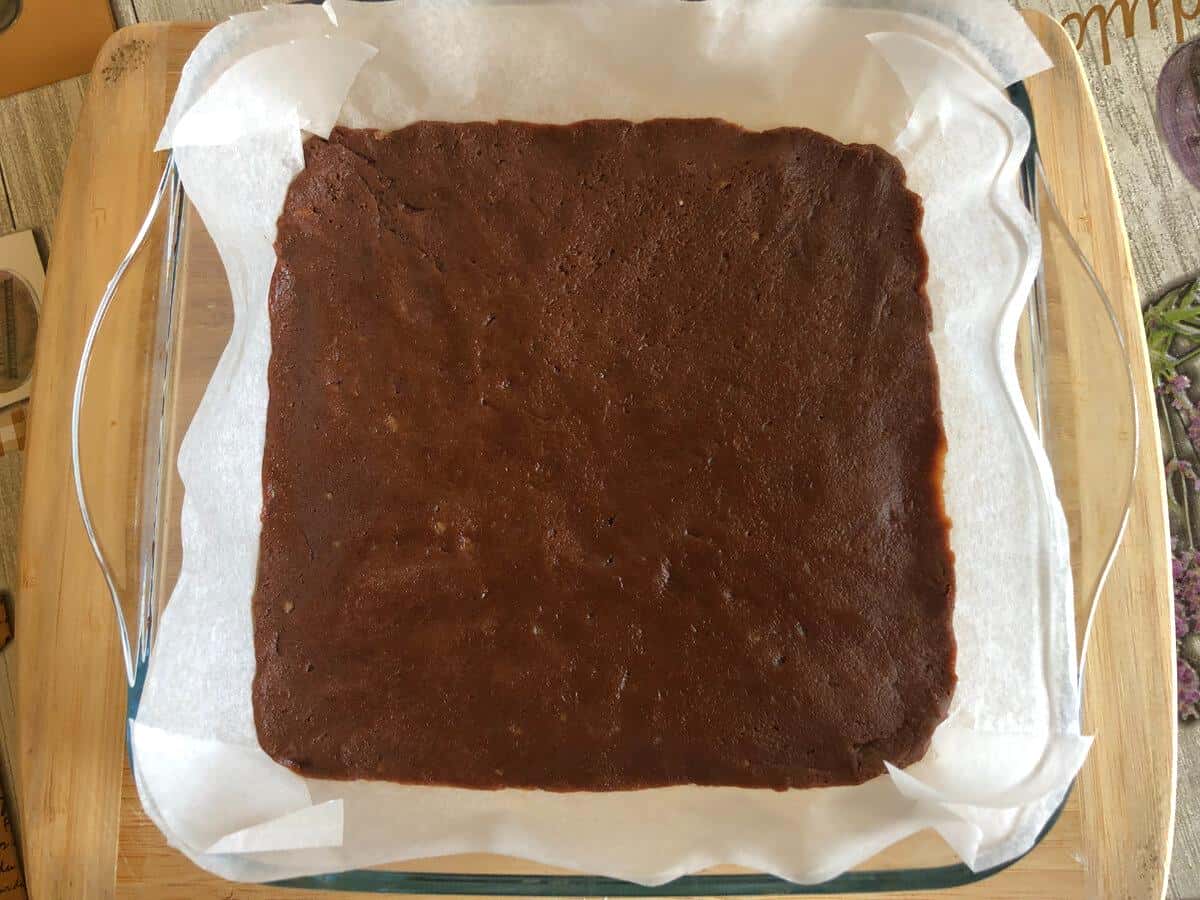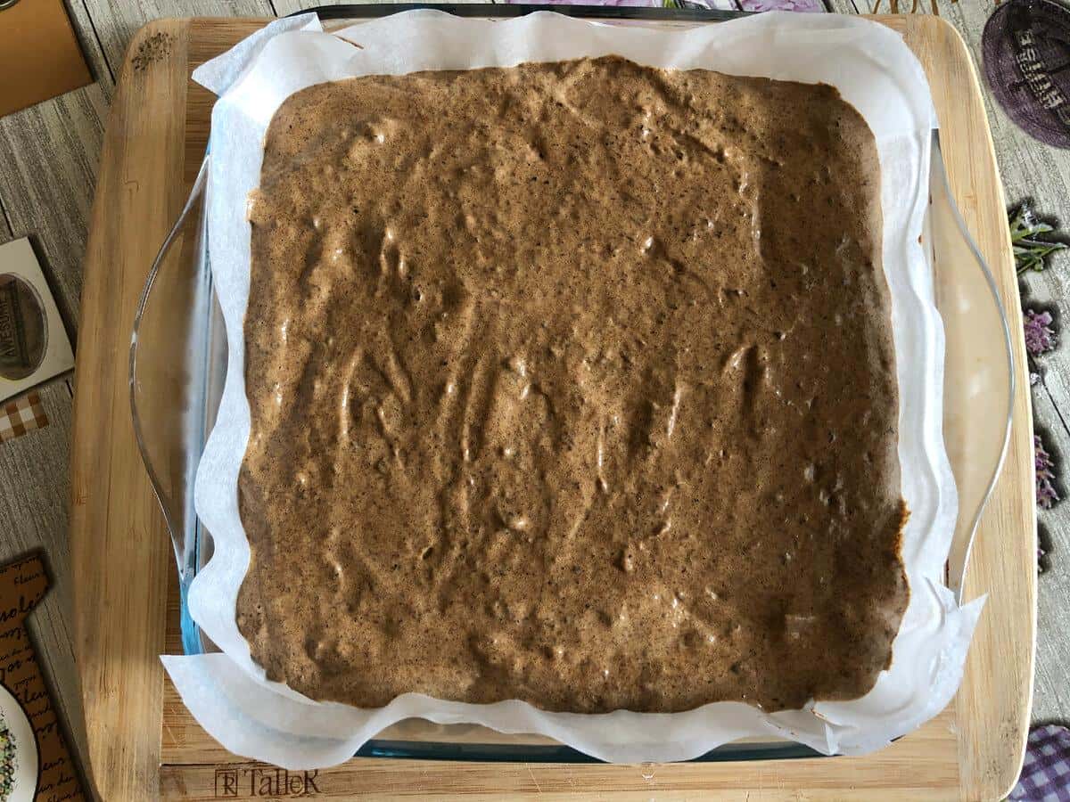 Форму для випікання (у мене 23 см) застеляємо пергаментним папером і розподіляємо тісто по всій поверхні. Бортики робити не потрібно.