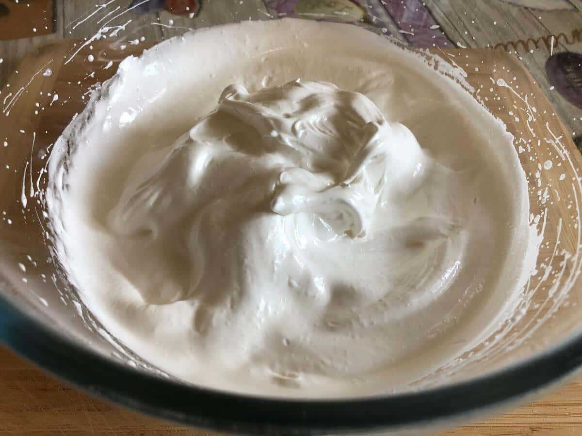 Тепер додаємо до білків ванілін і поступово всипаємо цукор, продовжуючи збивати ще близько 4 – 5 хвилин до середніх піків.