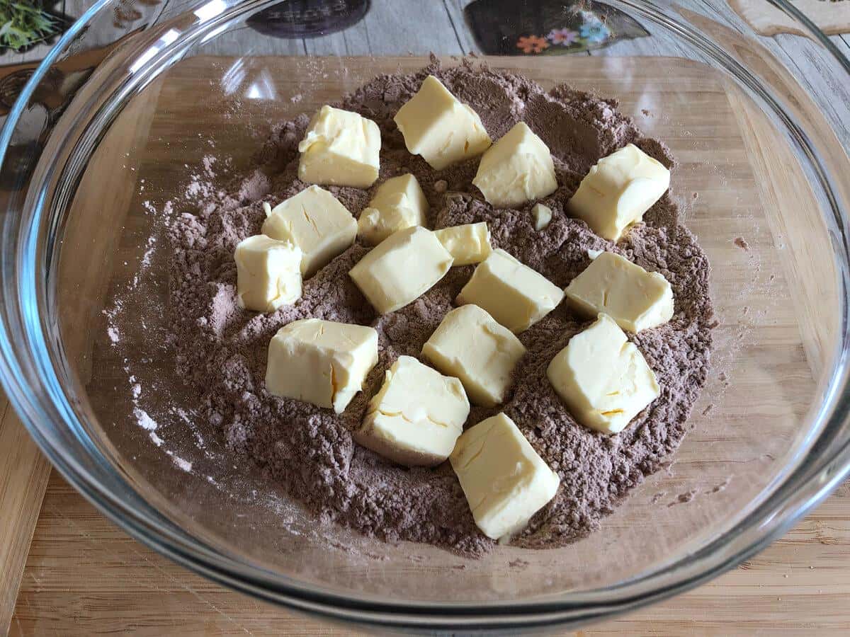 Вершкове масло дістаємо з холодильника і перетираємо з борошном до крихти.