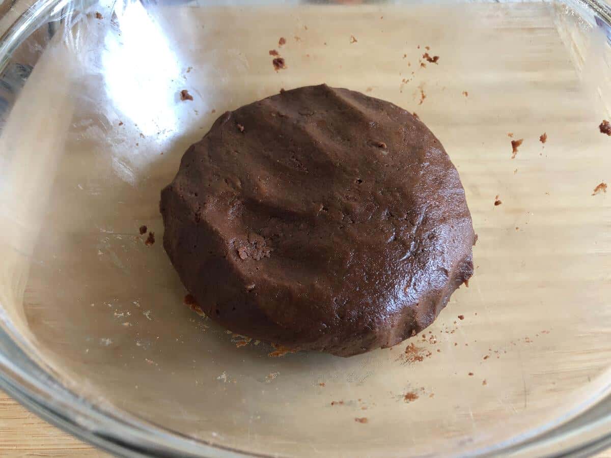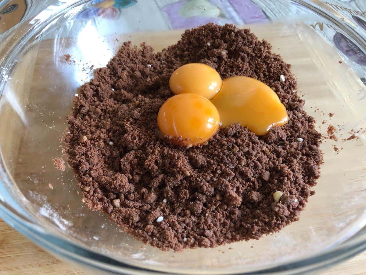 До шоколадної крихті додаємо 3 жовтка і замішуємо тісто.
