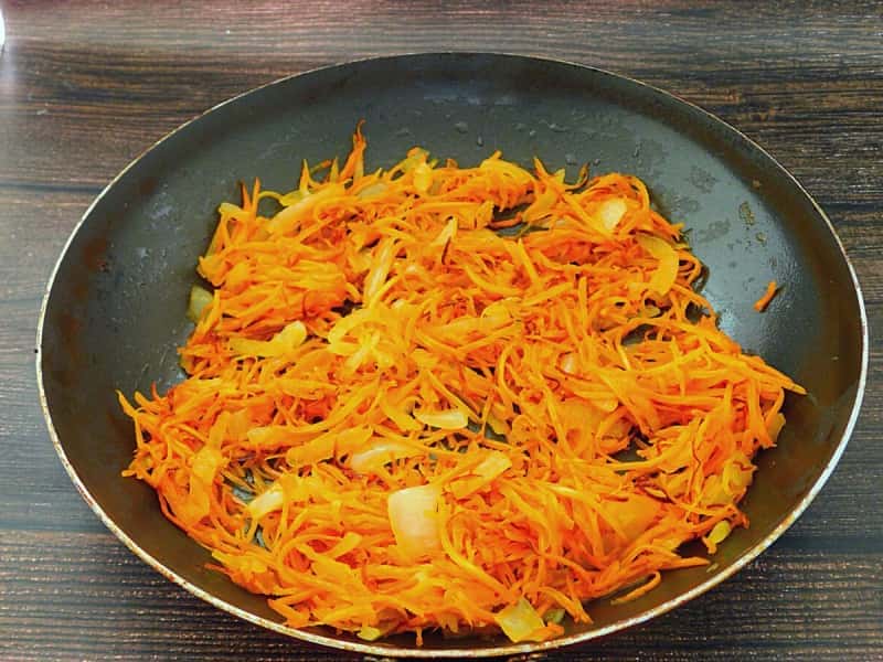 4. А в ту ж сковорідку помістити терту моркву та шматочки цибулі.