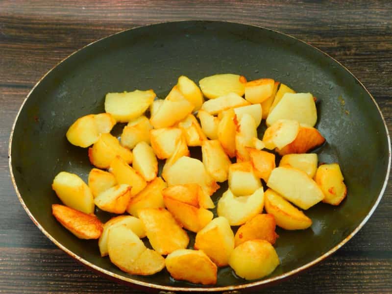 2. У сковорідці розігріти олію, викласти нарізану довільно варену картоплю.