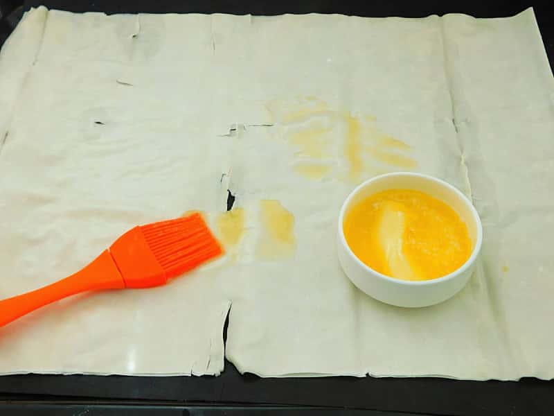 7. Потримати на плиті, щоб випарувалася рідина з томатів. Тісто філо розгорнути, розтопити вершкове масло. Укладати на лист по одному листочку, промазуючи маслом за допомогою кисті. Так розмістити усі шари філо. Нічого страшного, якщо місцями тісто рватиметься, у готовій страві це непомітно.