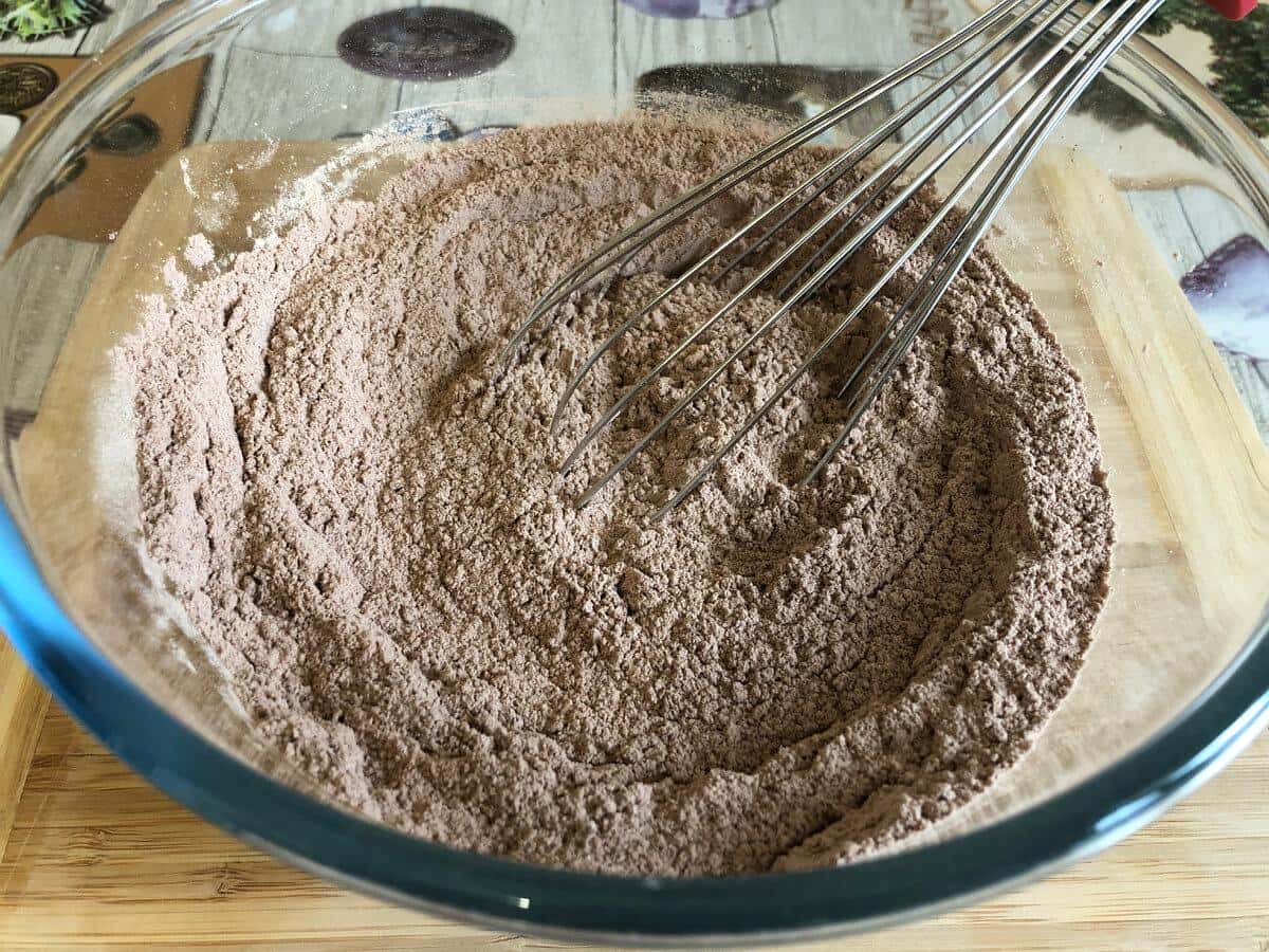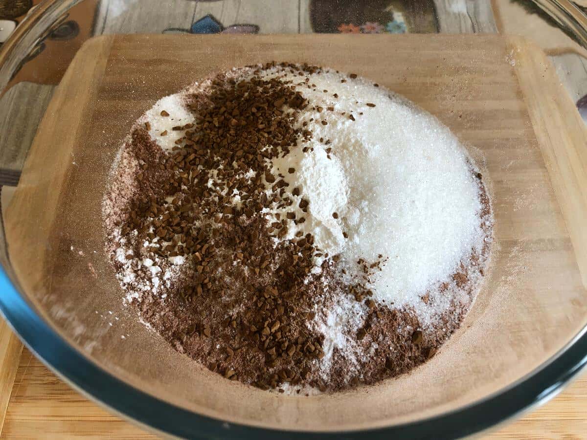 У миску просіюємо борошно, какао, додаємо цукор, розпушувач, ванілін, 1 ч. л. розчинної кави і дрібку солі. Ретельно перемішуємо вінчиком.