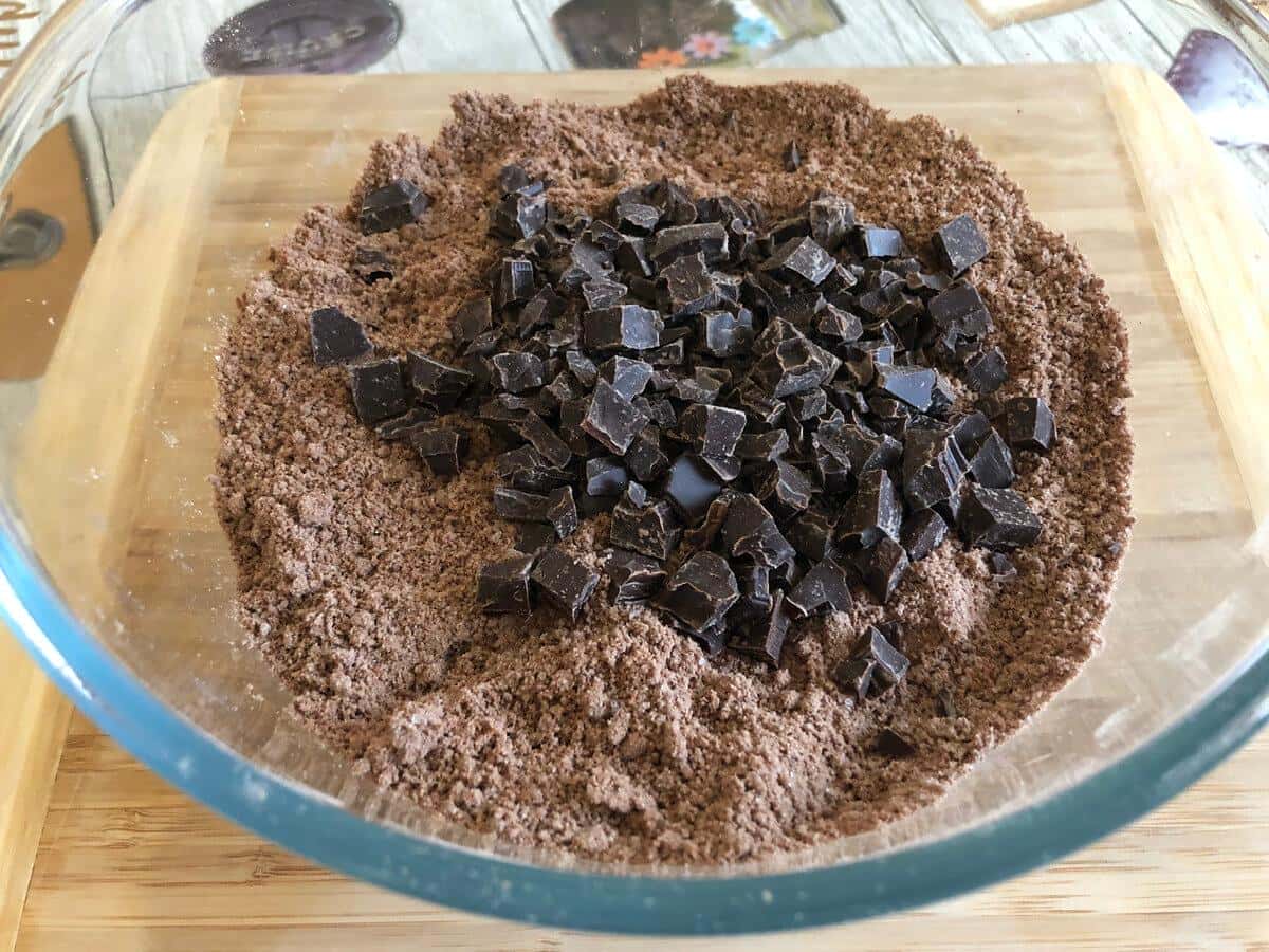 До шоколадної крихти додаємо шматочки холодного шоколаду. Трохи шматочків залиште, щоб посипати потім сконі зверху. Добре перемішуємо.