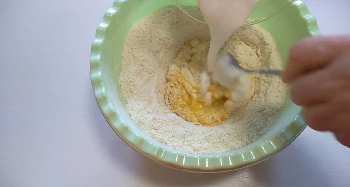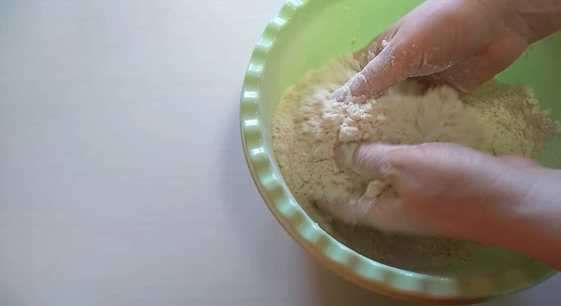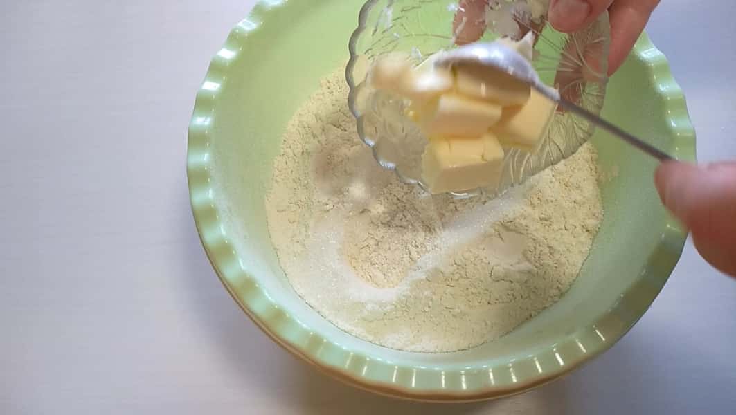 У борошно всипаємо 1/2 ч л солі, залишок цукру, ванільний цукор, вершкове масло, перетираємо в крихту.