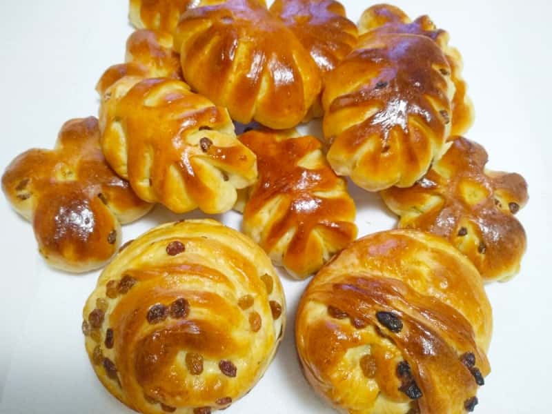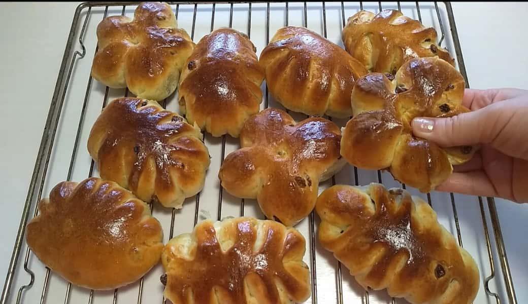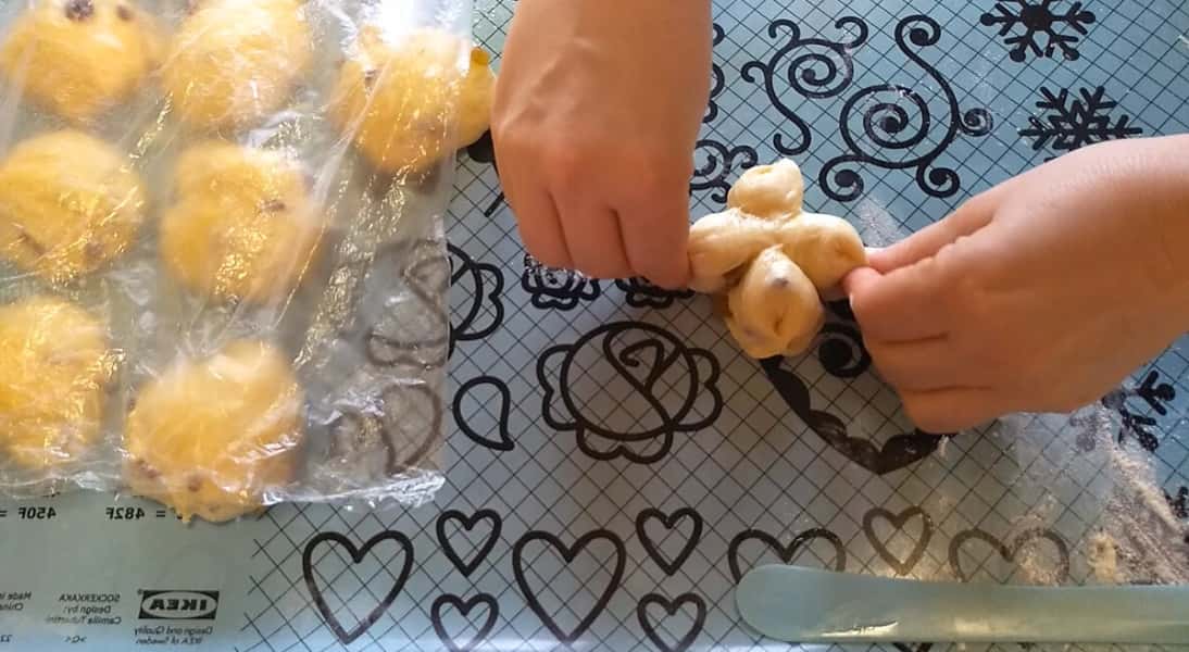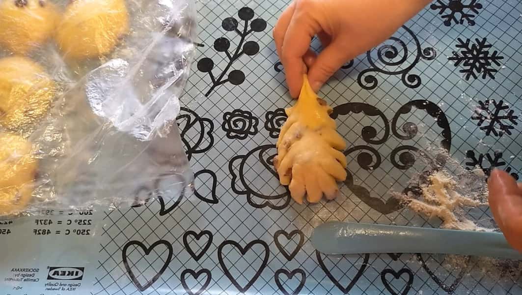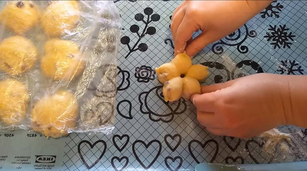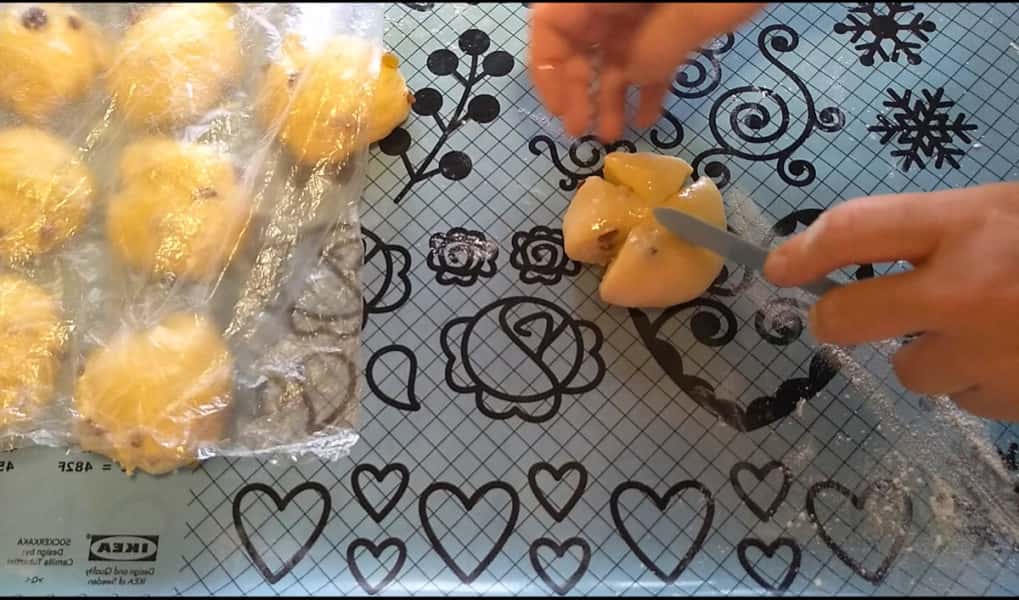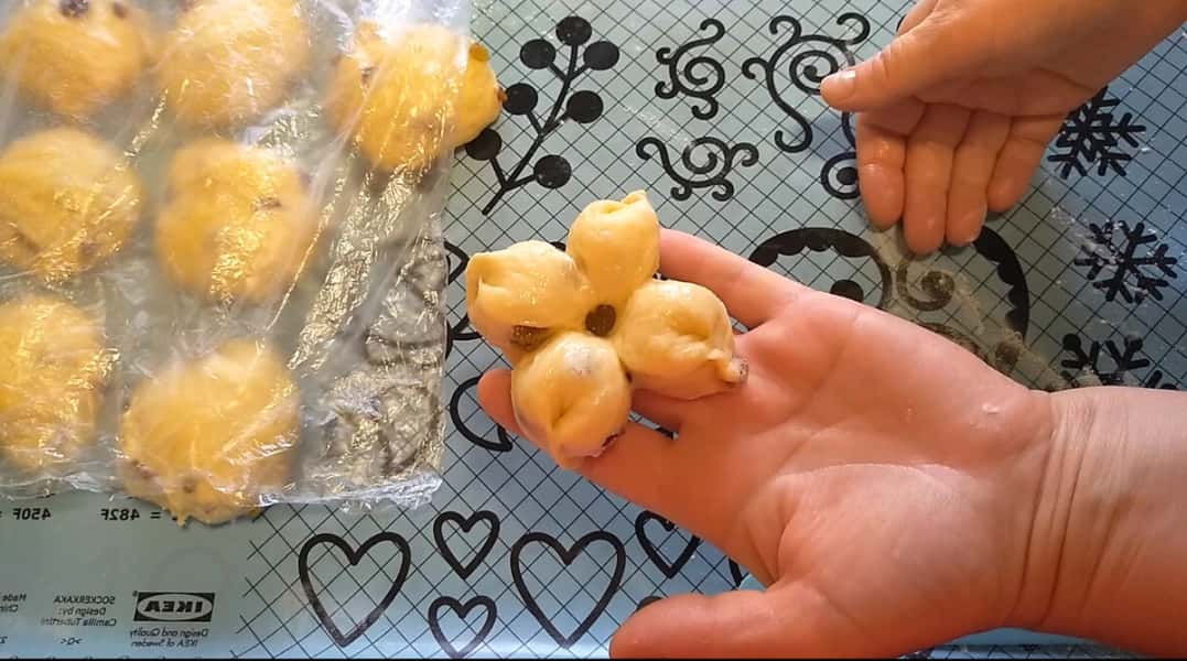 Формуємо булочки. Кожен шматочок підкачуємо, трохи зверху притискаємо, ніж змащуємо маслом і робимо чотири надрізи, руки припиляємо борошном і защипуємо хвостики, в серединки кладемо родзинки і вдавлюємо, виходить квітка на чотири пелюстки.
