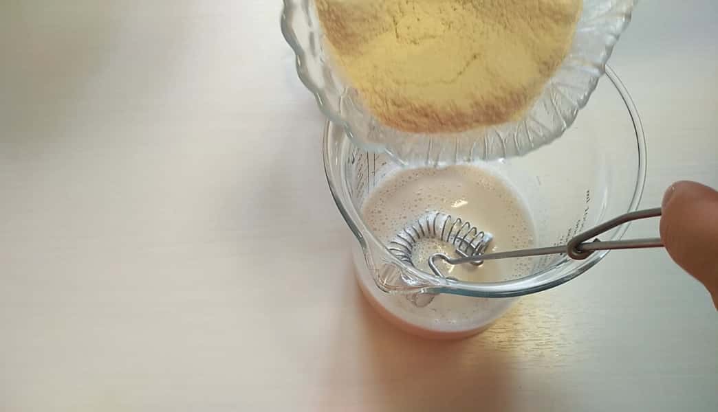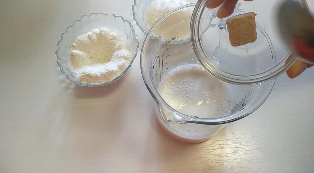 Додаємо 15 г свіжих дріжджів, залишаємо на 2-3 хвилини, розмішуємо.