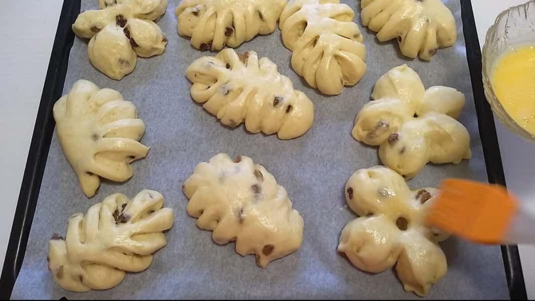 Сформовані булочки накриваємо та ставимо підходити на 15-20 хвилин. Зверху змащуємо збитим яйце. Ставимо випікатися в розігріту до 180 градусів духовку на 15-20 хвилин, орієнтуйтеся на своєю духовкою.