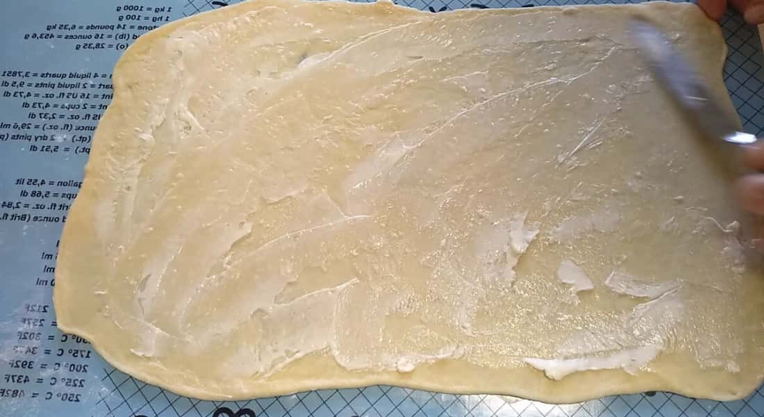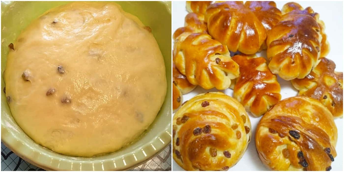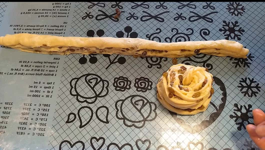 Тісто, яке я залишала, підійшло, я його трохи підмісила, розкачала в пласт розміром 30х45 см, змастила вершковим маслом, посипала родзинками, звернула в рулет, накрила плівкою та залишила на столі на 10 хвилин. Потім рулет розрізала вздовж і сформувала дві булочки. Поставила на вистоювання на 45 хвилин, змастила яйцем. Випікала 25 хвилин при температурі 180 градусів.