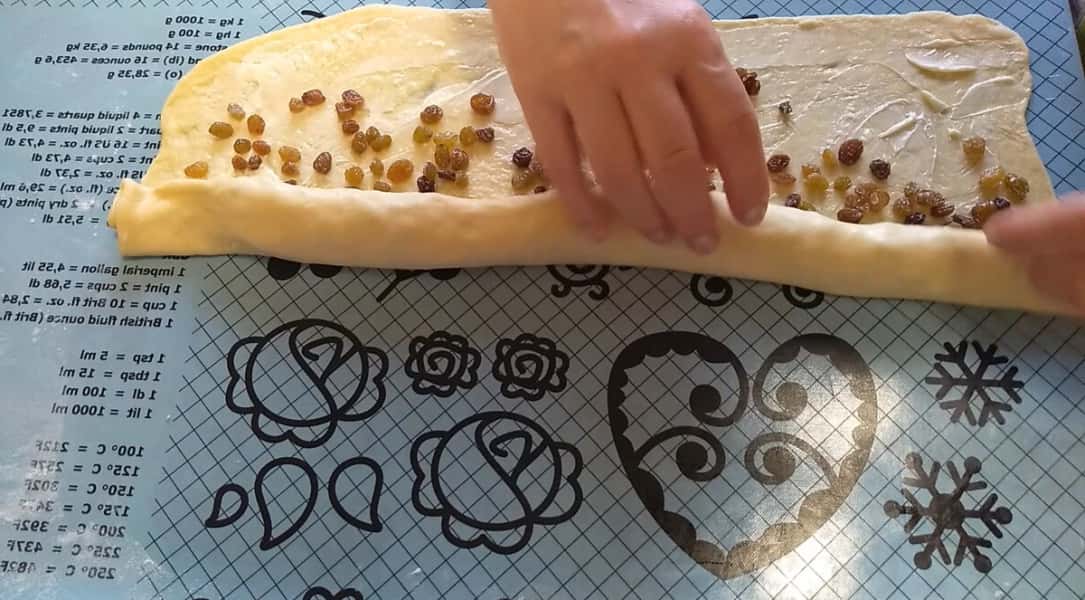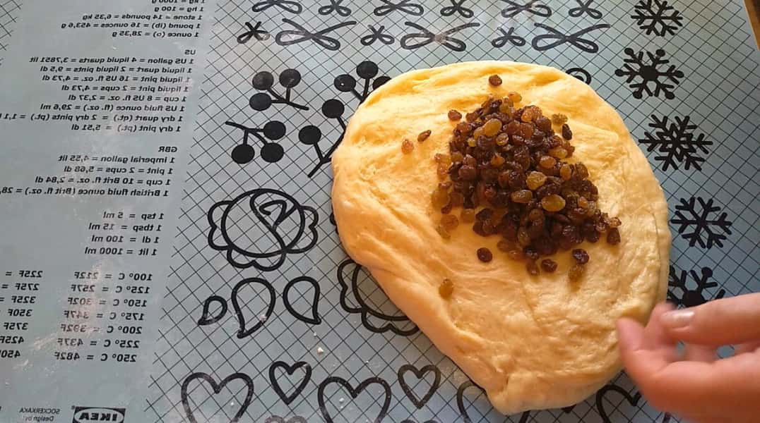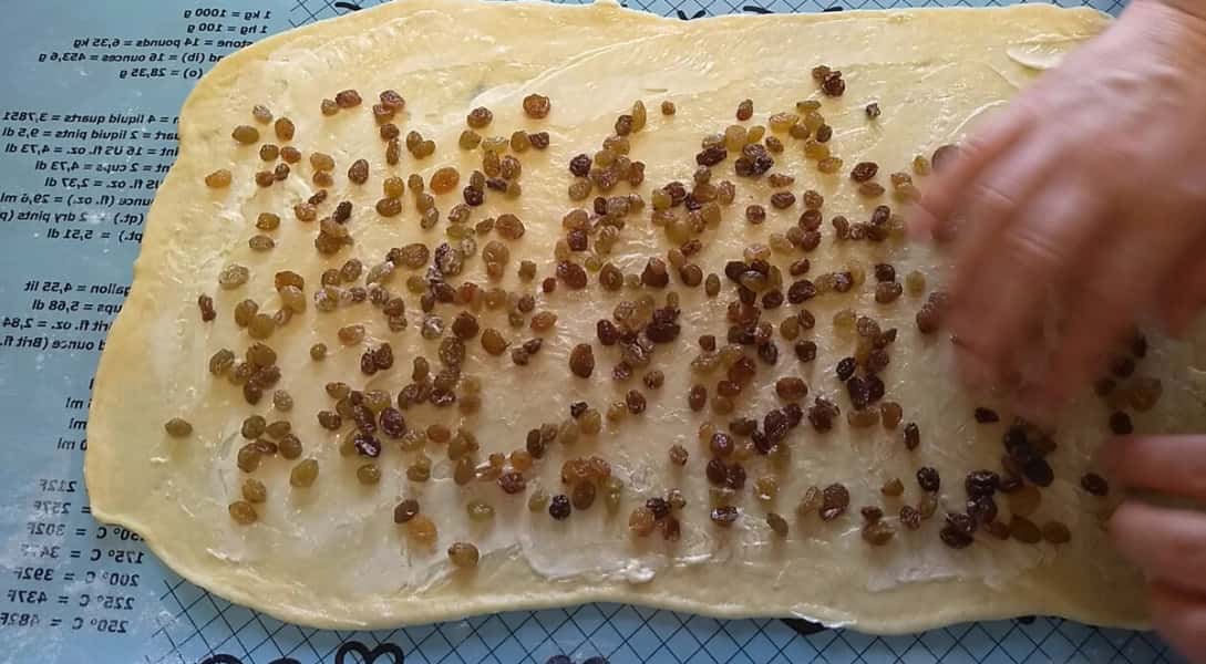Розтягуємо, викладаємо вимиті і обсушені родзинки, вмішуємо в тісто.