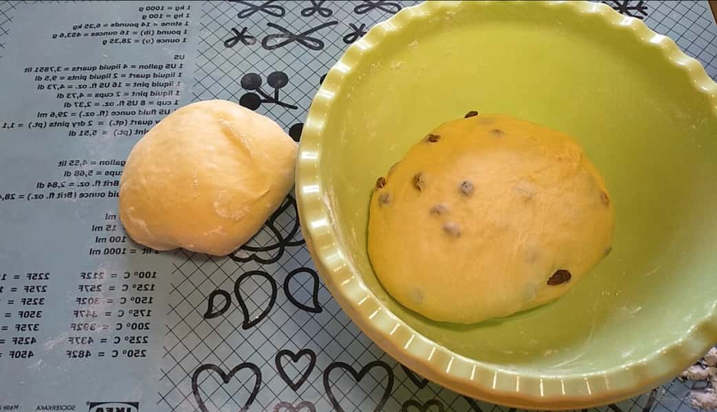 Округляємо та ставимо підніматися на 40 хвилин. Шматок тіста ( вагою 350 г) я відокремила, без родзинок, випікатиму у формі , його я теж залишаю на підйом.
