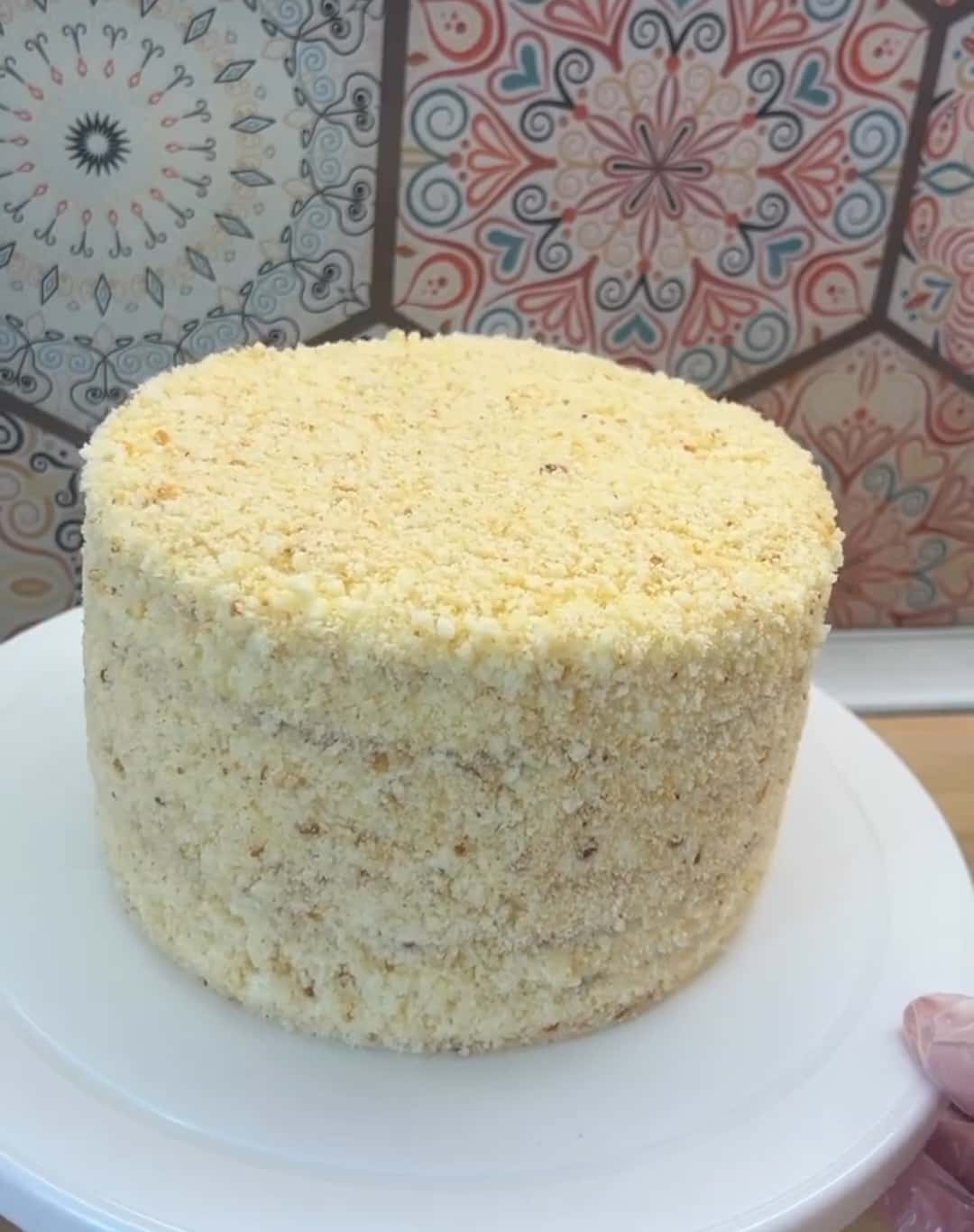 Торт можна вирівняти будь-яким кремом, прикрасити за бажанням, у нас домашній торт, тому той же крем наношу і присипаю крихтою.