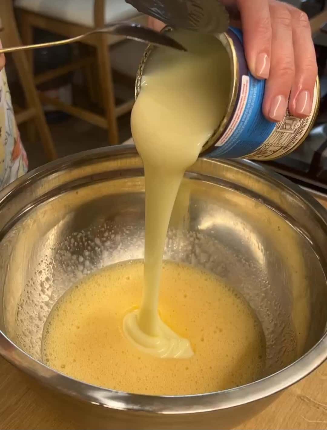Яйця збиваю вінчиком, додаю розтоплене вершкове масло, змішую. Додаю згущене молоко, змішую.