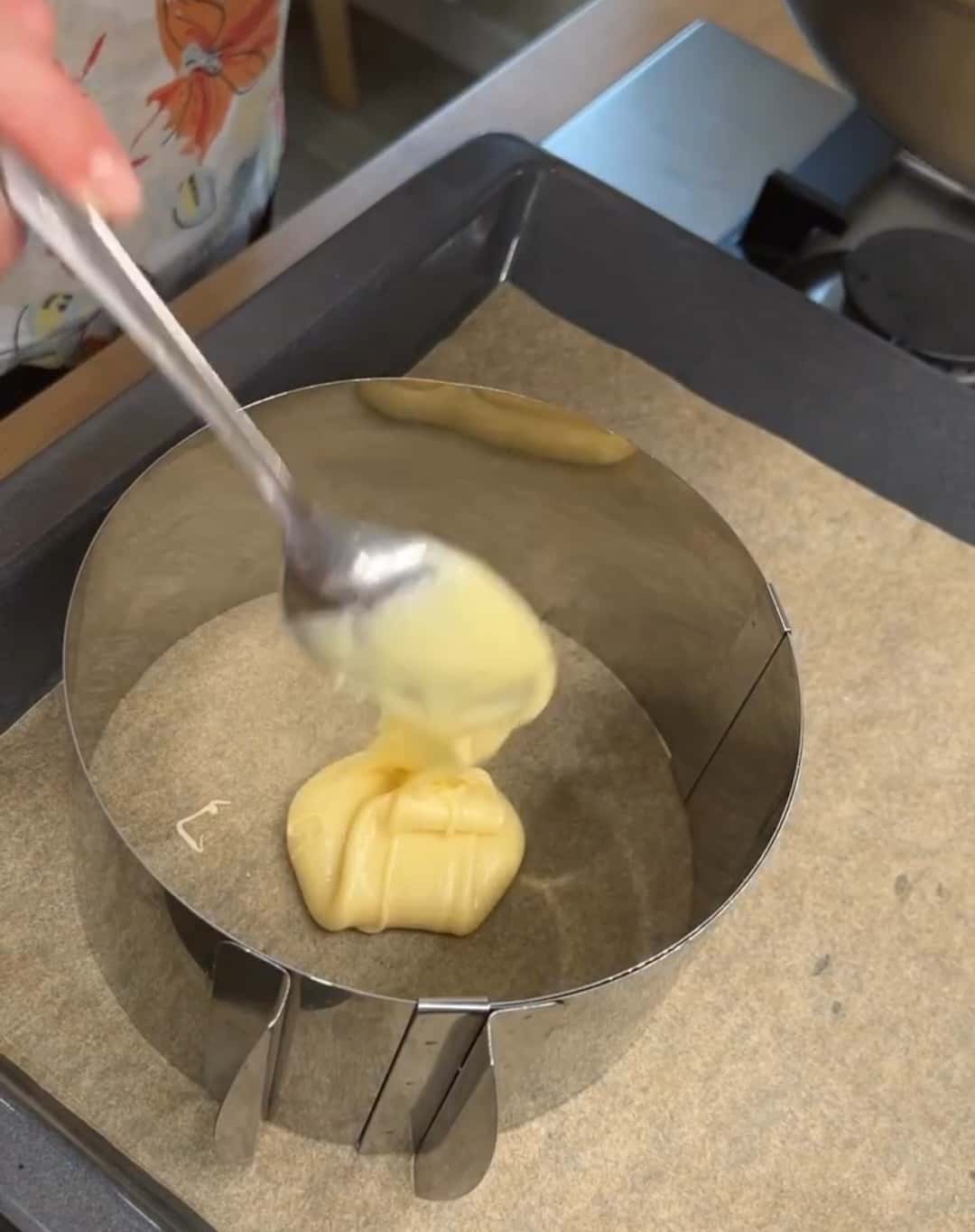 Викладаю тісто 2 ст. л. в роз’ємну форму діаметр 16 см, розрівнюю.