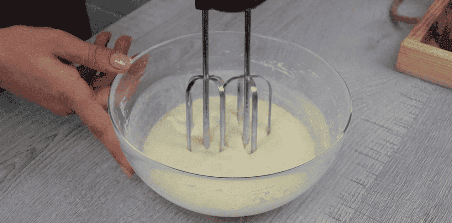 4. Просіюємо 120 г борошна, 5 г розпушувача та замішуємо тісто без грудочок. Воно досить густе.