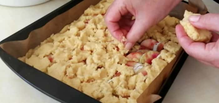 - Щоб верх пирога вийшов красивим, я беру решту тіста і відриваю від нього маленькі шматочки, якими накриваю начинку.