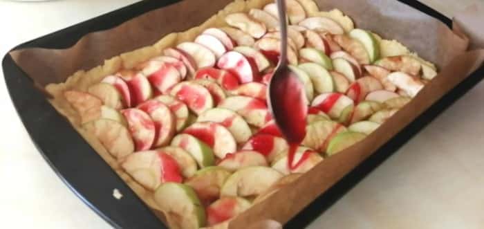 - Укладаємо розкачане тісто на папері для випічки в деко і формуємо бортики висотою 1,5 – 2 см. Викладаємо на тісто скибочки яблук. У нас в сім’ї люблять щоб начинки було багато, тому яблук я не шкодую.