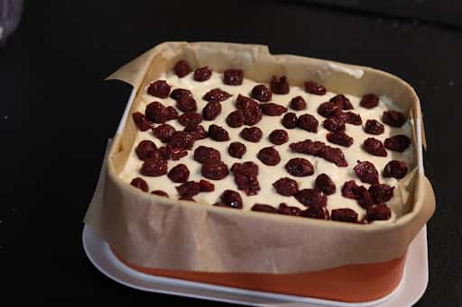Зверху покласти вишні. Поставити сирник в духовку (полицю нижче середини) розігріту до 175 градусів С приблизно на 1 годину 15 хвилин. На дно духовки можна поставити форму з водою. Остудити сирник в духовці відчиненій. Перед подачею посипати зверху цукровою пудрою або полити шоколадною глазур’ю.