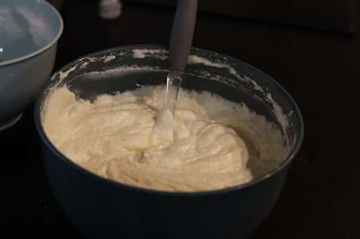 Потім додати сир, лимонний екстракт, борошно і знову збити до однорідної маси;