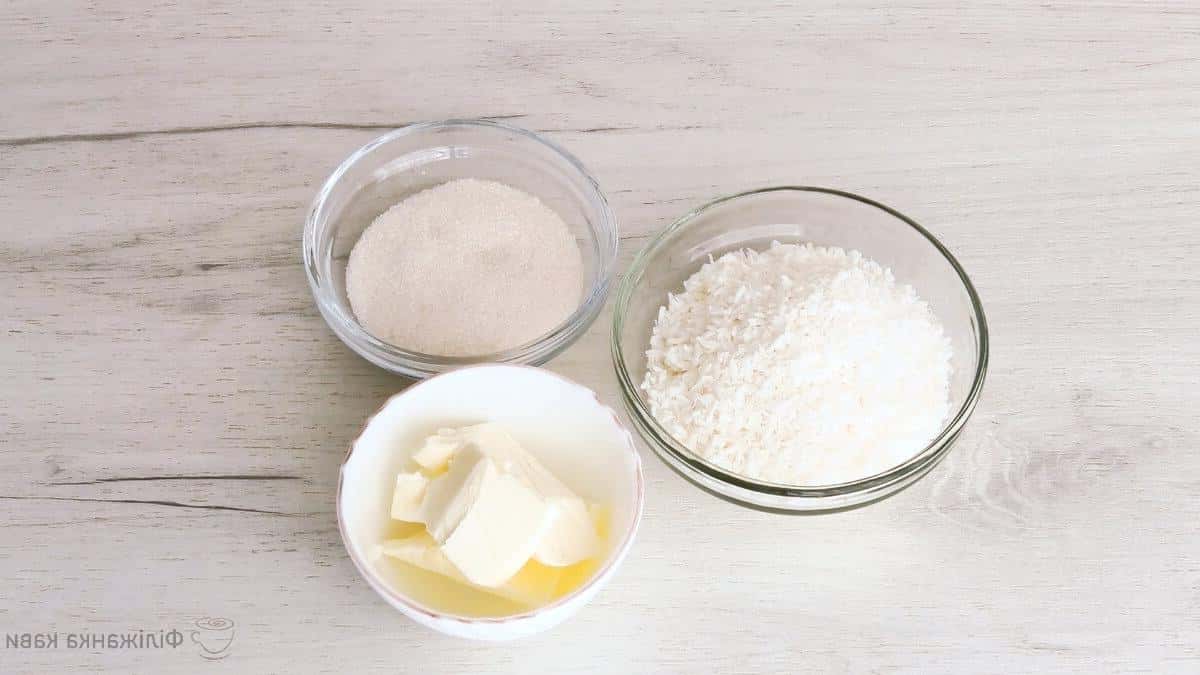 Додати цукор і кокосову стружку, добре перемішати і обсмажити до легкого золотистого кольору.