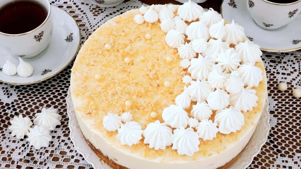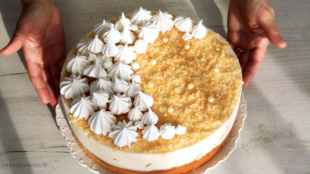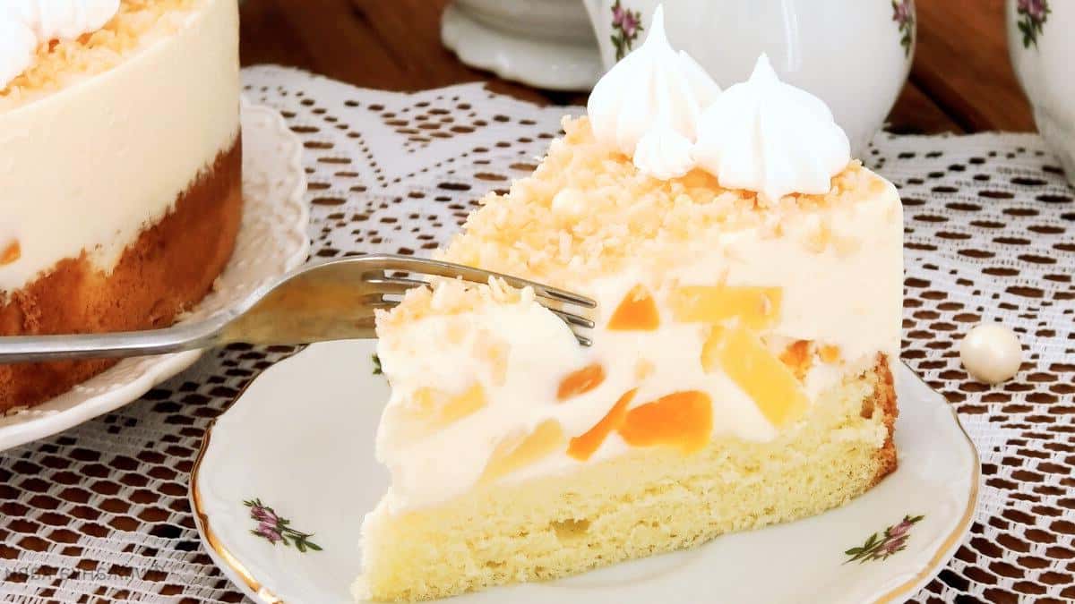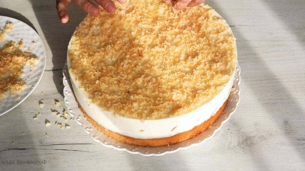 Сьогодні від щирого серця хочу поділитися з вами рецептом дуже смачного торта. Він складається з легкого ванільного бісквіта, просоченого ананасовим сиропом, ніжного повітряного суфле з великою кількістю персиків і ананасів. А зверху я доповнила торт карамелізованою стружкою кокоса.