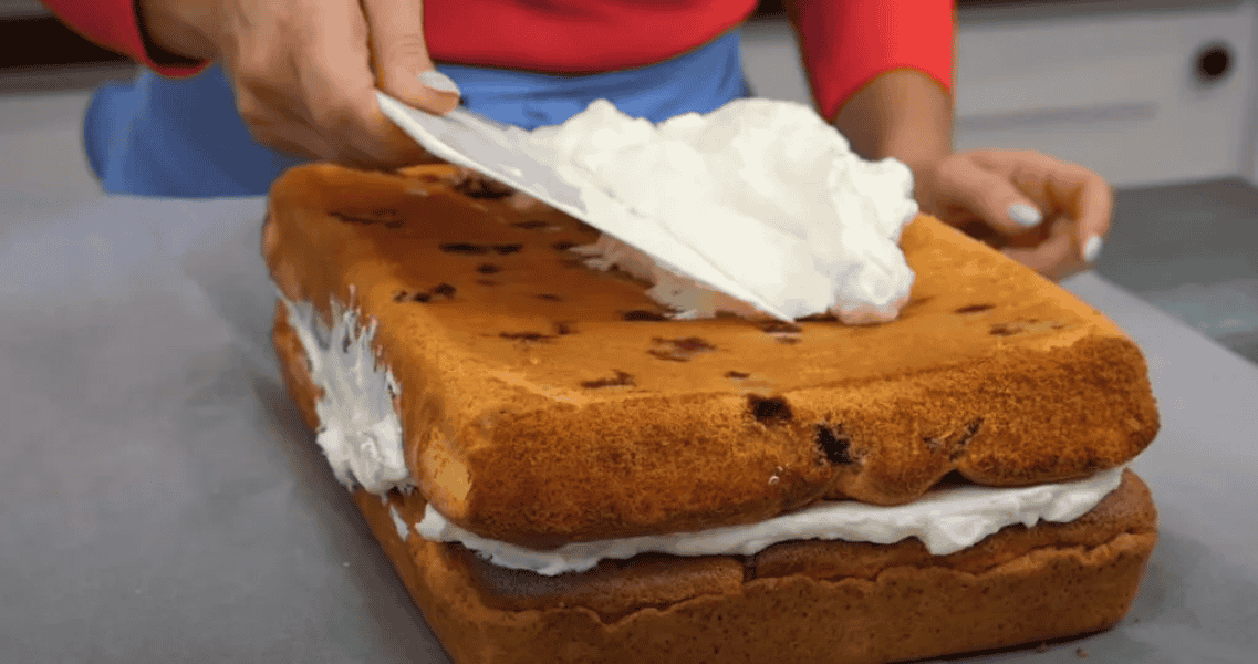 Формуємо торт, викладаючи крем на коржі, змащуємо верх і боки.