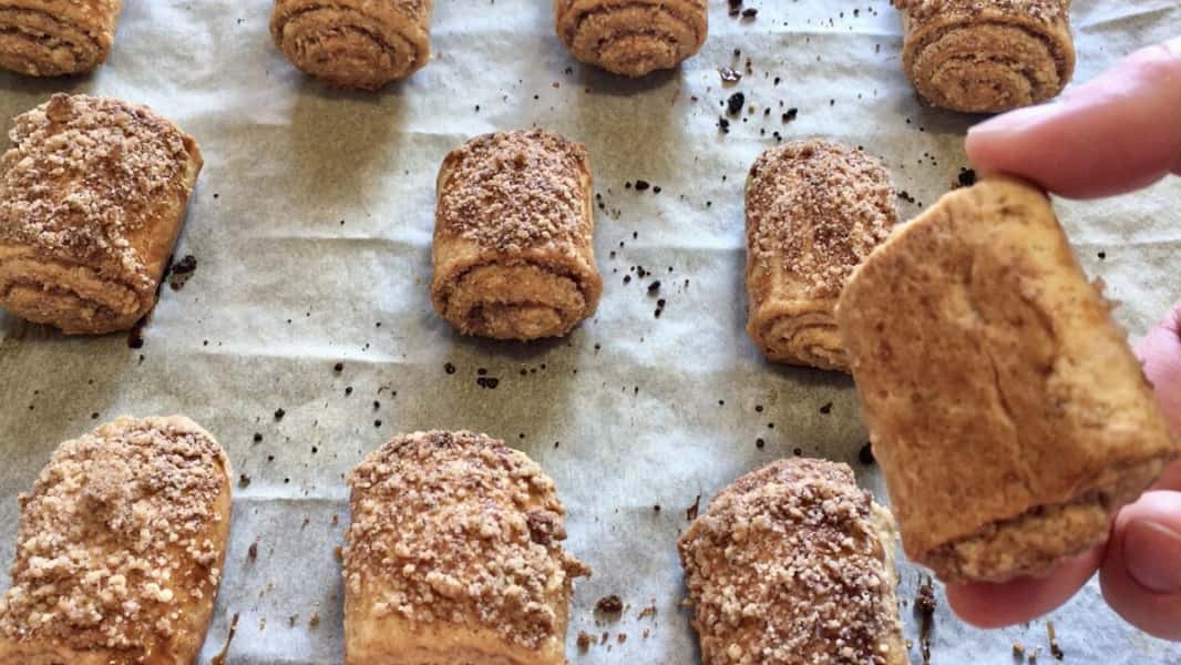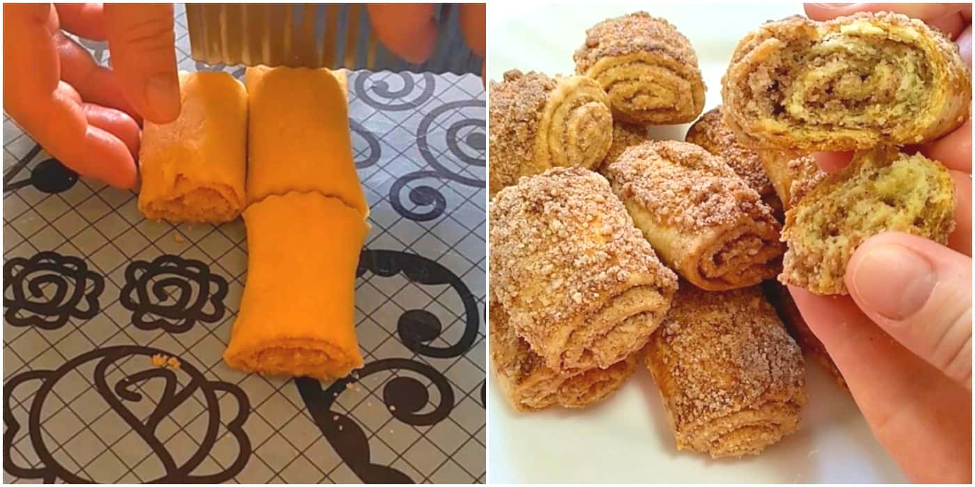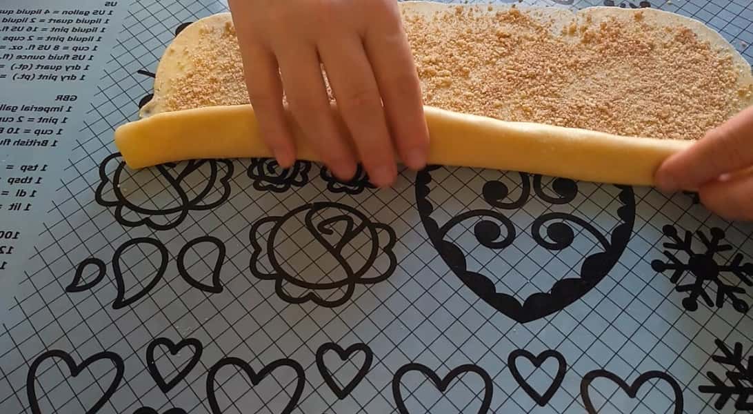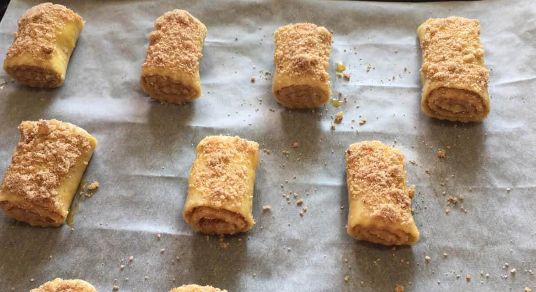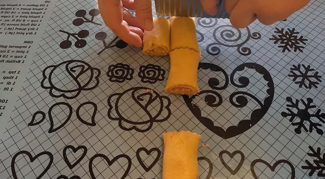 Потім згортаємо в рулет, защипуємо краї та нарізаємо на порційне печиво приблизно по 6 см.
