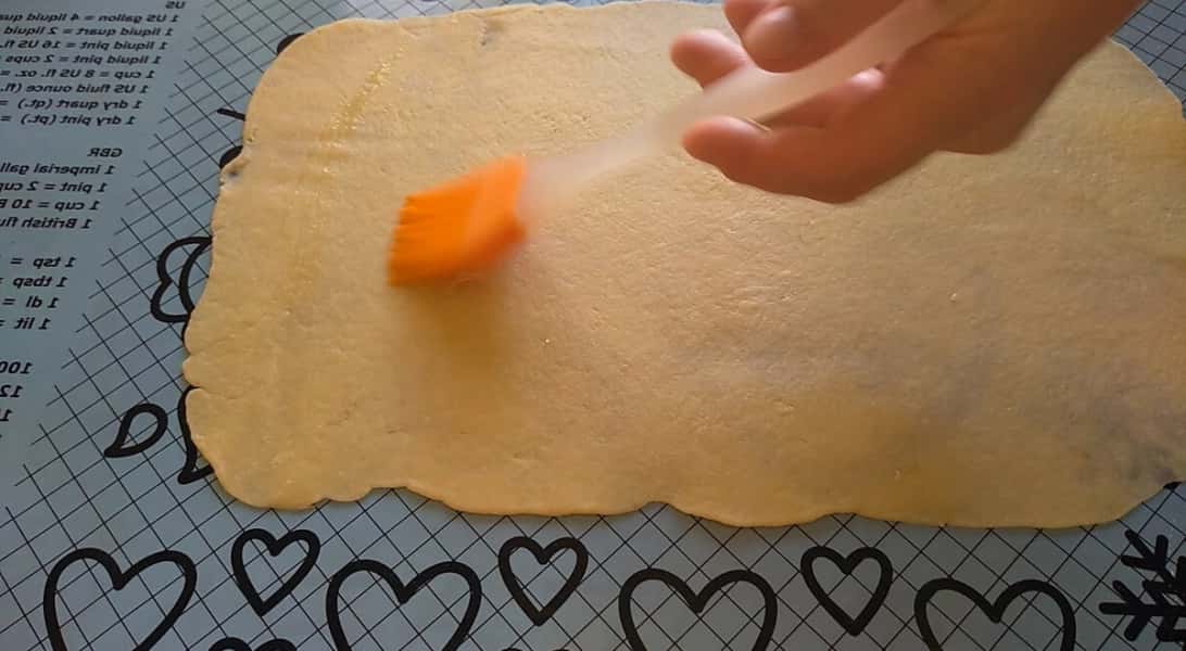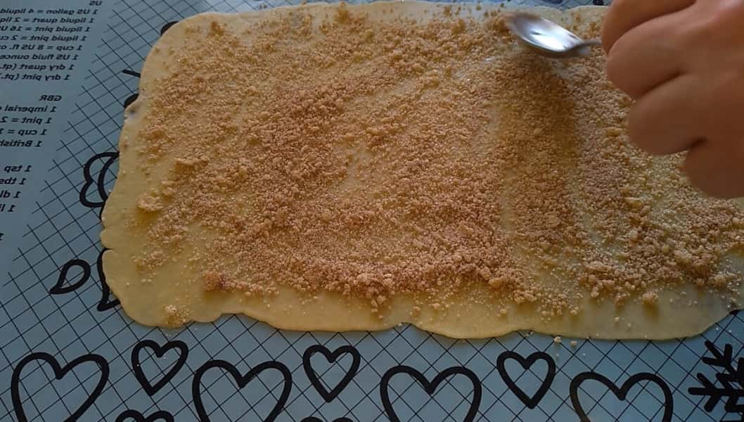 Тісто відпочило, ділимо на дві частини. Розгортаємо в тонкий прямокутник приблизно 36х22 см, злегка змащуємо холодною водою і посипаємо цукровою крихтою.