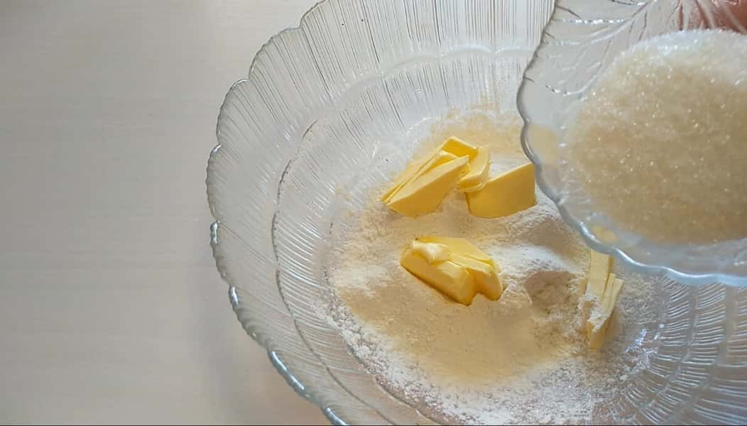 У миску просіюємо 50 г борошна, додаємо 60 г цукру і 30 г холодного вершкового масла і все швидко перетремо у крихту.