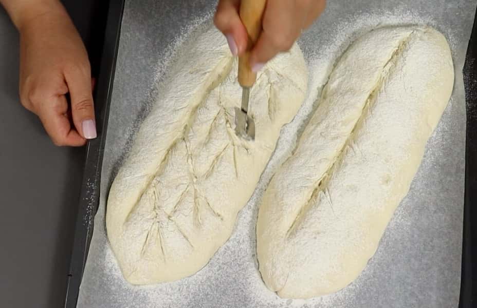 Лезом або тонким гострим ножем робимо по одному глибокому надрізу ближче до краю. І я вирішила ще поекспериментувати та зробила на хлібі малюнок, але розрізала вже не так глибоко.