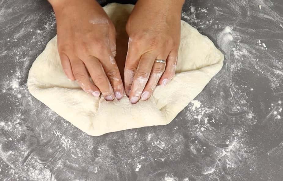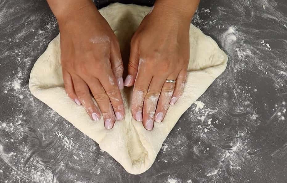 Руки та стіл змащуємо олією та перекладаємо тісто на робочу поверхню. Складаємо його конвертиком, згинаючи по черзі сторони до центру та округляємо. Тісто найніжніше та дуже м’яке.