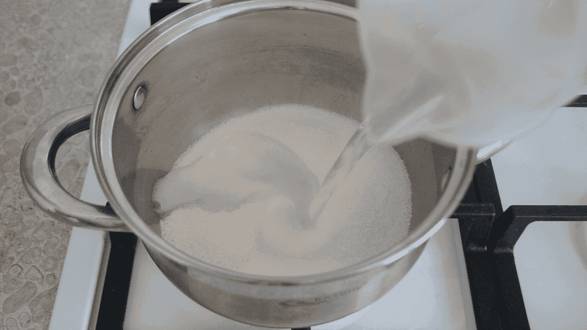 Приготуємо глазур для пасок на желатині, яка не кришиться. Желатин заллємо водою, перемішаємо і залишимо на 15-20 хвилин. У каструлю висипаємо 2 склянки цукру, виливаємо 150 мл води. Ставимо на вогонь і варимо до розчинення цукру.