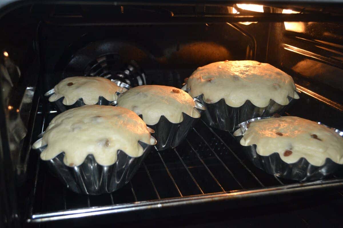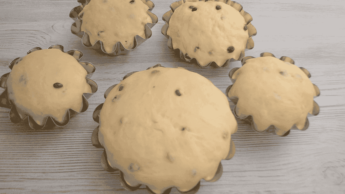 Тісто, що підійшло обминаємо і наповнюємо форми, змащені олією. Потім форми з тістом накриваємо рушником і залишимо на 30 хвилин.