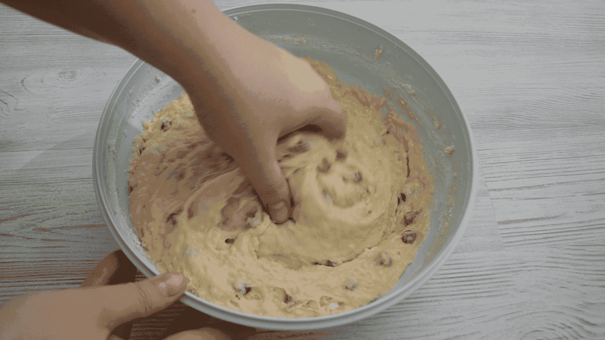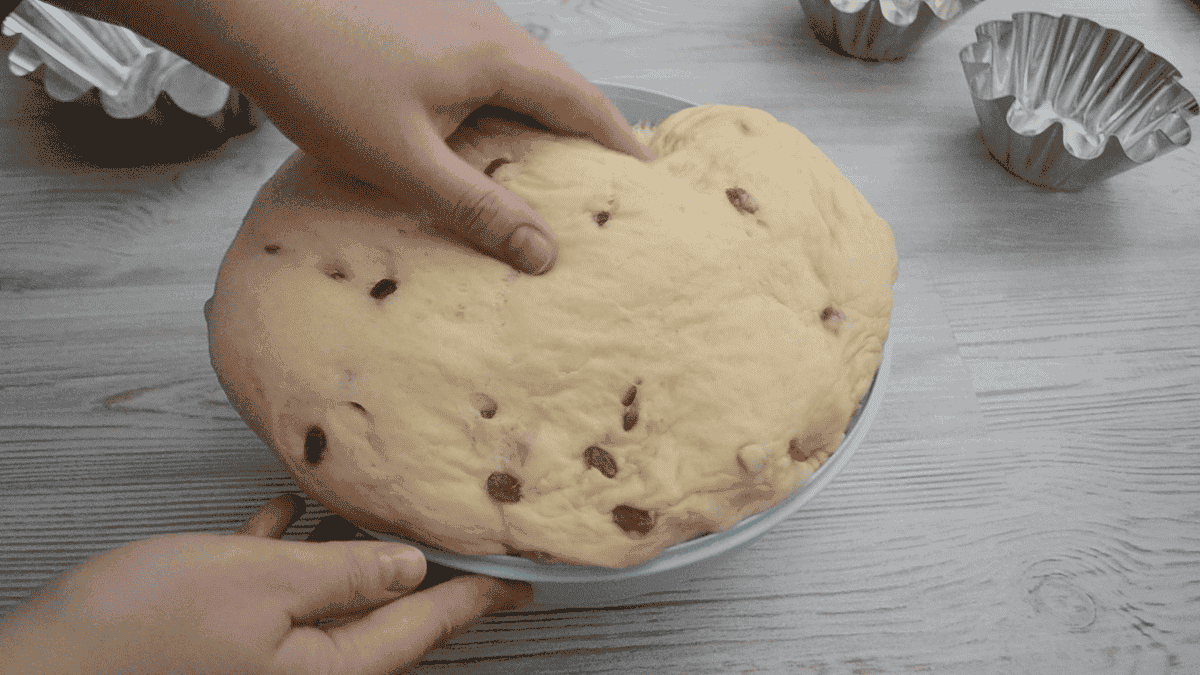 Перемішуємо вінчиком до однорідності. Перекладаємо 150 г промитих родзинок, перемішуємо, накриваємо рушником і прибираємо в тепле місце на 1,5 години.