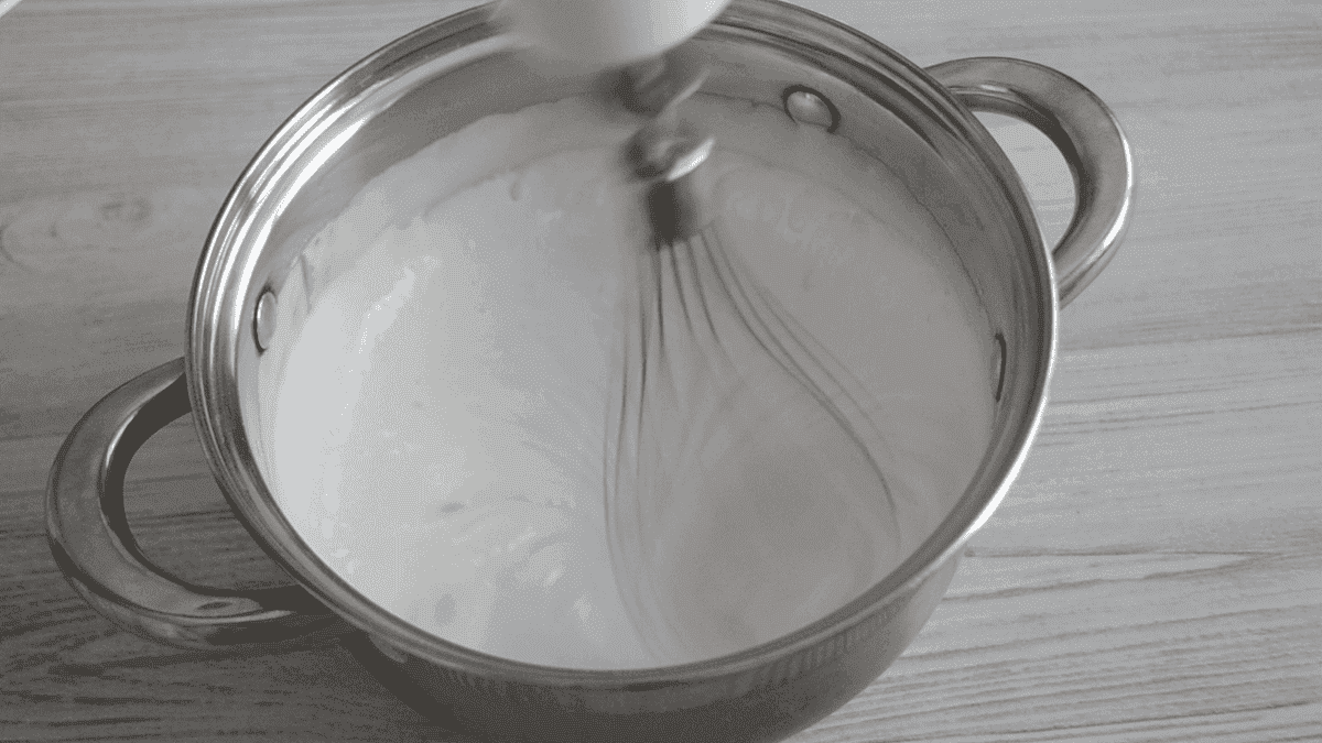 Як тільки цукор розчинився додаємо желатин і вимикаємо вогонь, швидко перемішуємо, щоб желатин розчинився. Збиваємо гарячий сироп протягом 3-4 хвилин до пишної білої маси. В кінці додамо трохи лимонного соку.