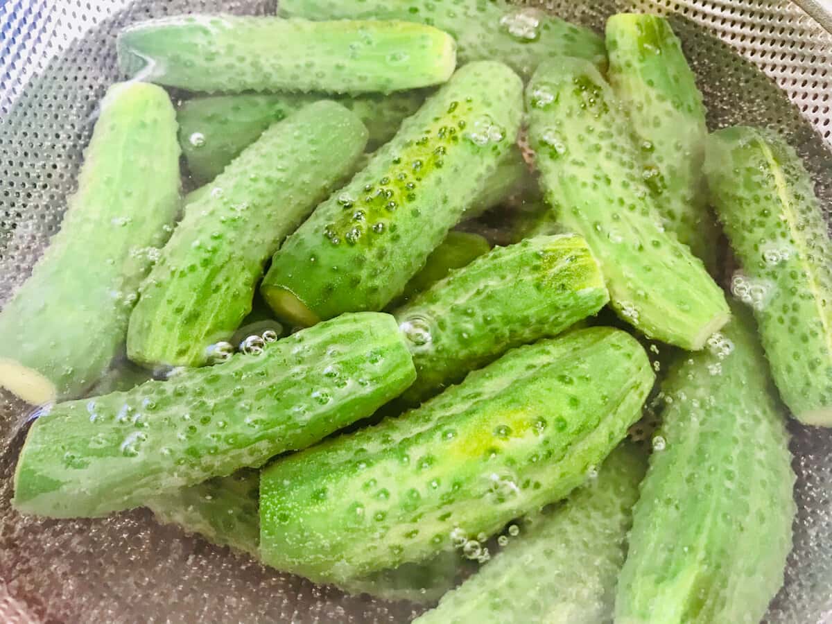 Огірки мию і обрізаю кінчики. Це зовсім необов’язково. Можна нічого не обрізати. Огірки складаю в друшляк.