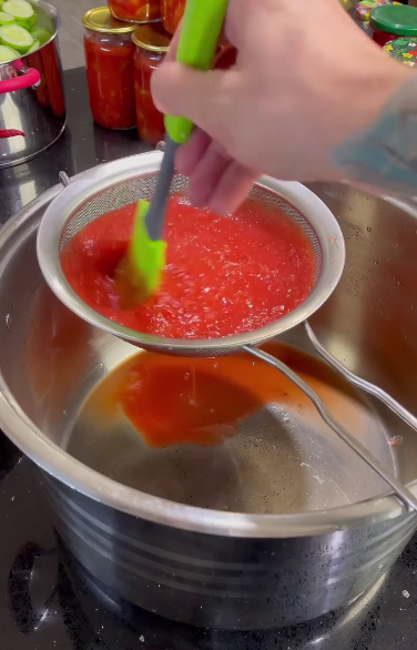 3) Занурювальним блендером пробиваємо томати до однорідного стану. Проціджуємо через сито. Якщо немає блендера, можна відразу процідити через сито. У нас має вийти томатний сік без шкірки та насіння.