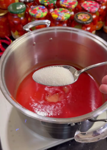 5) В томатний сік додаємо сіль, цукор і олію, перемішуємо, ставимо на плиту.