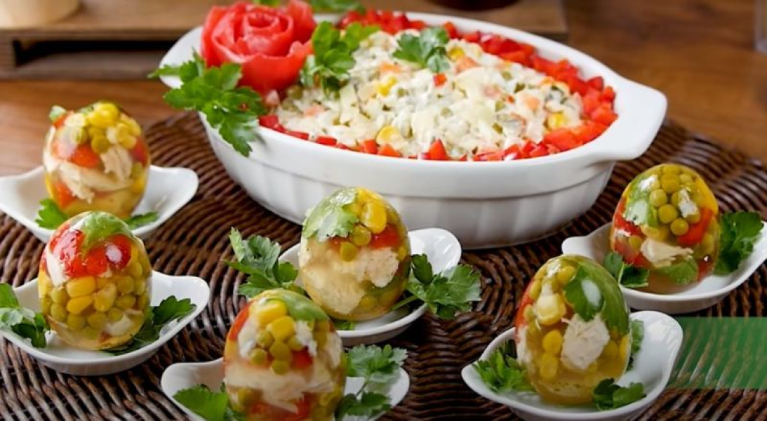 У результаті виходять цікаві яйця у желе, які будуть оригінальною окрасою столу. А якщо у вас залишилася начинка, можна зробити салат.