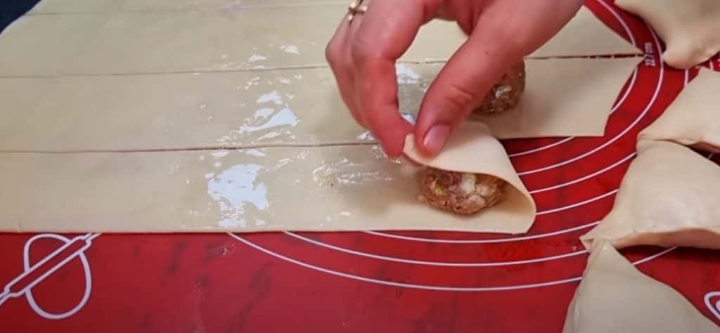 - Кладемо на край фарш і загортаємо кілька разів трикутником, відрізаємо від смужки та защипуємо краї. Так робимо із усіх смужок.