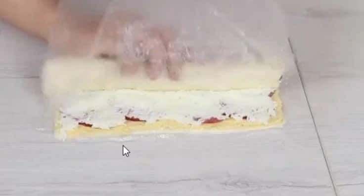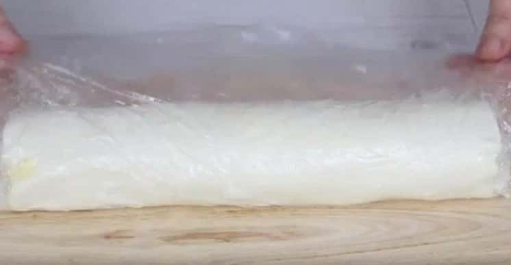 - Сирний пласт з начинкою за допомогою пакету, що залишився, згортаємо в щільний рулет.