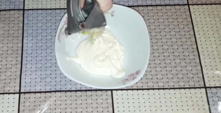 - У мисці змішуємо майонез зі сметаною. Додаємо часник пропущений через прес, можна трохи підсолити та поперчити.