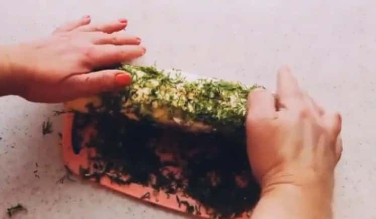 - Рулет звільняємо від плівки. Обвалюємо та обсипаємо його з усіх боків зеленню.