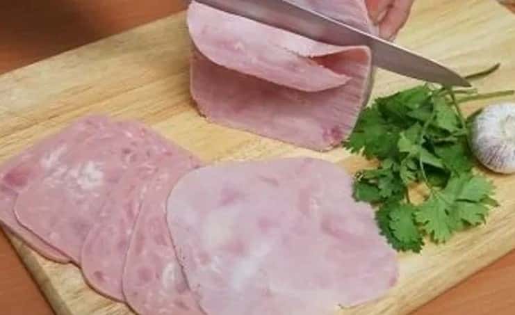 - Наступним шаром поверх жовткової маси викладаємо тонкі пластини шинки.