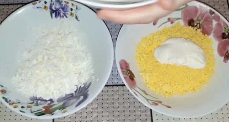 - Розв’язуємо та розправляємо пакет. Не дістаючи сирки з пакета, роздавлюємо та розминаємо їх столовою ложкою, щоб вони стали тоншими.